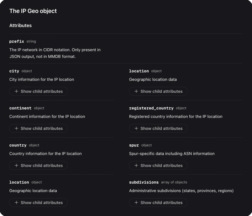 - Seamless Integration: IP Geo is available to integrate with your Spur Data Feeds or plug into your existing analytical pipelines.